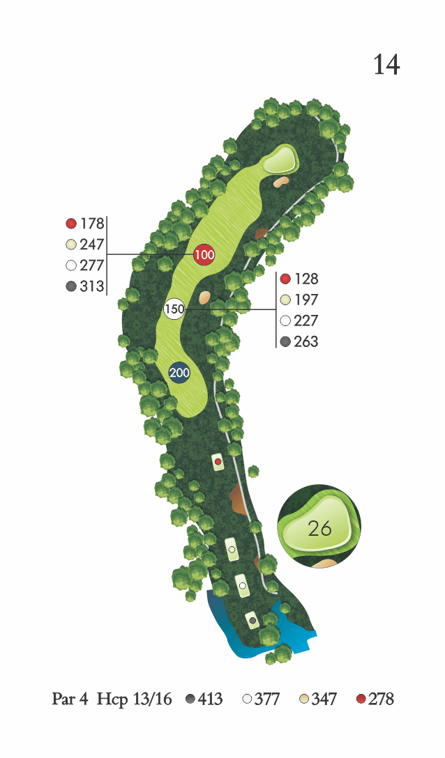 This par 4 turns sharply to the right, tempting players to cut the corner over the trees. While the aggressive line can shorten the hole, it also brings unnecessary risk. The smart play is a controlled tee shot to the fairway, setting up a clear approach into the green and a solid chance at par.